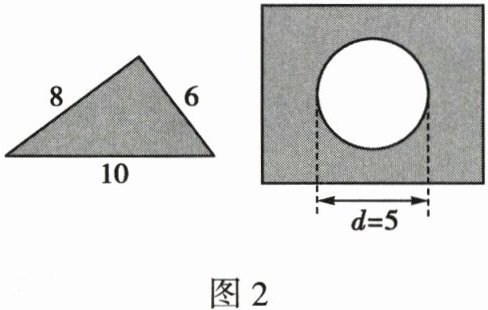 直角三角形塑料片的面积为$6×8÷2 = 24(cm^{2}),$直角三角形塑料片斜边上的高为24×2÷10 = 4.8(cm)。 因为4.8cm<5cm,所以直角三角形塑料片能从长方形塑料片的空心圆孔穿过去.