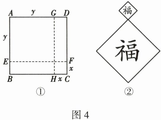 18. (9分)春节贴“福”字是我国由来已久的风俗,它寄托了人们对幸福生活的向往,也是对美好未来的祝愿。如图4①是一张正方形纸片,李明用剪刀沿虚线剪开,制作成如图4②所示的新年挂图。