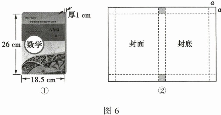 22. (10分)小莹非常喜欢数学,十分爱护数学书,她通常会选用封皮来精心包裹书本。现有一本如图6①所示的数学书,其长为26cm,宽为18.5cm,厚为1cm,小莹用一张长方形纸包好了这本数学书,封皮展开如图6②所示,图中虚线为折痕,阴影是被裁剪掉的部分,四角均为大小相同的正方形,正方形的边长即折进去的宽度为 $a cm$。