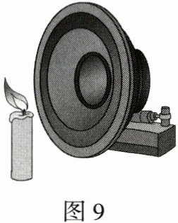 4. 如图 9 所示,将一支点燃的蜡烛放在扬声器的前方,当扬声器发出较强的声音时,可以看到烛焰随着音乐的节奏晃动,扬声器的纸盆由于_发出声音,声音通过空气传到烛焰处,烛焰的晃动说明声可以传递_。古代战场上常用“击鼓进军,鸣金收兵”作为命令,说明声可以传递_。