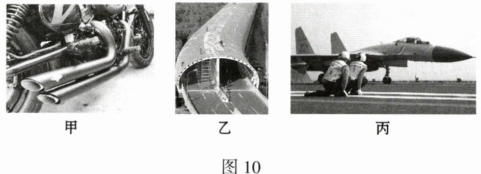 1. 噪声令人心烦意乱,是四大环境污染之一。如图 10 所示,请分析:图甲中“摩托车的消声器”是在_;图乙中穿越北京动物园的“隔音蛟龙”是在_;图丙中航空母舰上的起飞引导员佩戴耳罩等降噪装备是在_。