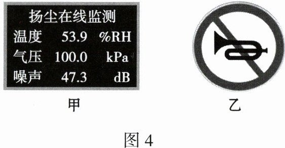 (选填“音调”或“响度”)。图 4 乙中的标志是提醒人们从声源