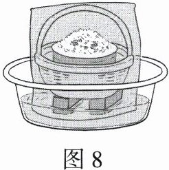 2.在通风的地方放一盆水,在盆里放两块高出水面的砖头,砖头上搁一只比盆小一点的篮子。篮子里放剩饭、剩菜,再把一个薄毛巾或纱布袋罩在篮子上,并使其边缘浸入水里(如图8所示),就做成了一个简易冰箱。把它放在通风的地方,可在较短时间内保持里面的饭菜不会变质。下列关于简易冰箱制冷原理的分析正确的是 (