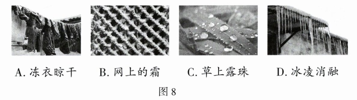 8.D 【解析】冻衣晾干是冰升华为水蒸气;霜是水蒸气凝华而成的;露是水蒸气液化形成的;冰凌消融是固体的冰凌熔化成液态的水。故选D。