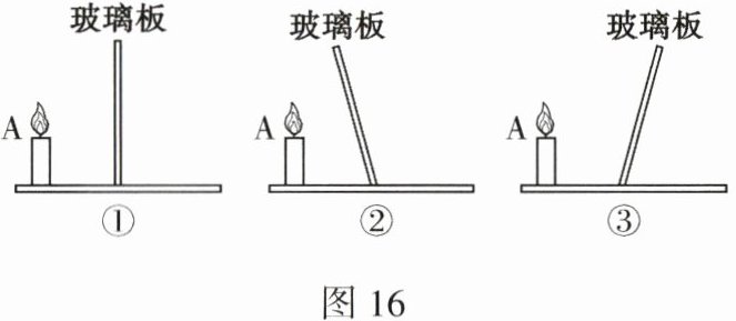 (5)若将蜡烛 A 立在水平桌面上,点燃蜡烛观察发现:玻璃板中蜡烛 A 的像偏低且倾斜。你认为在图 16 所示的三幅图中,