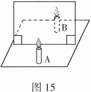 18. 如图 15 所示,小明同学在做“探究平面镜成像的特点”的实验时,选择的实验器材有:一张白纸、一块玻璃板、刻度尺、铅笔、大小完全相同的蜡烛(两根)。将白纸平放在水平桌面上,再将玻璃板竖直立在白纸上。