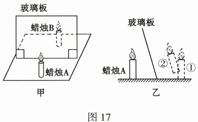 像。若将玻璃板向左倾斜,如图 17 乙所示,观察到蜡烛 A 的像的大致位置在图中的②
