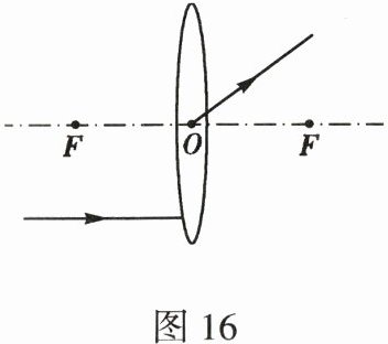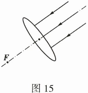 1. 据晋代张华的《博物志》记载:“削冰令圆,举以向日,以艾承其影,则得火。”这种利用冰透镜向日取火的方法,体现了我国古代劳动人民的智慧。如图 15 所示,若把冰块制成的凸透镜正对着太阳,将太阳光看成平行光,冰透镜的焦点为 $ F $,请在图中完成光路。