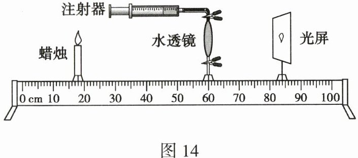 3. 在“爱眼日”宣传活动中,小明用图 14 所示的装置研究眼睛的成像,此时烛焰在光屏上成清晰的像,用此模拟正常眼睛的成像。接下来下列操作可模拟近视眼的是(