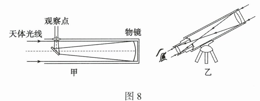 13.(双选)某市天文台配备有反射式望远镜、光学望远镜等多种观测设备。反射式望远镜的原理如图 8 甲所示,利用一个球面反射镜将进入镜头的光线会聚后反射到位于镜筒前端的一个平面镜上,然后再由这个平面镜将光线反射到镜筒外的目镜里,这样我们便可以观测到星空的影像。而光学望远镜的原理如图 8 乙所示,下列说法正确的是()