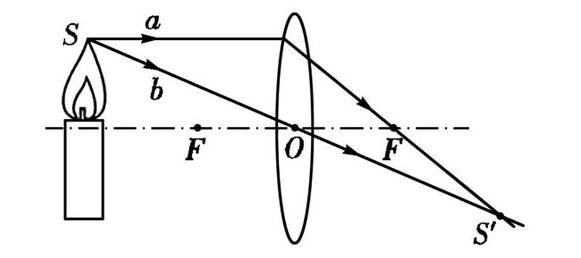 1. 由点$S$发出的平行于主光轴的光线$a$,经过凸透镜后,通过焦点$F$,即光线$a$经过凸透镜后折射光线通过$F$。