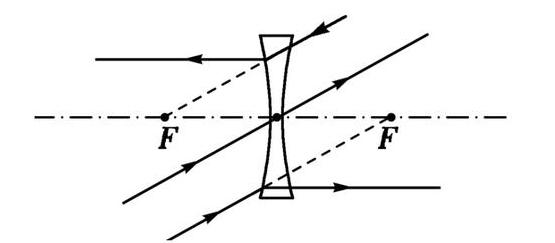 过凹透镜光心的光线传播方向不变,从左侧焦点$F$发出的光线经凹透镜折射后,折射光线平行于主光轴。