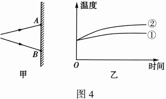 5. 如图 4 甲所示,AB 之间是太阳光经三棱镜色散后在屏上得到的彩色光带。将电子温度传感器分别放在 A、B 两点外侧,测得温度随时间变化的图像如图 4 乙所示。则曲线①对应光线的特点是