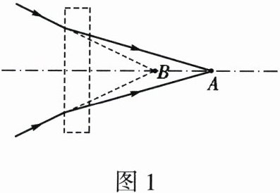 1. 如图 1 所示,一束光经过一个透镜后会聚于主光轴上的点 A,去掉透镜后光会聚于点 B,则该透镜起到
