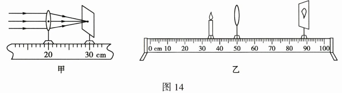 (1)如图 14 甲所示,让凸透镜正对平行光,调整凸透镜到光屏的距离,光屏上会出现一个很小、很亮的光斑,则该凸透镜的焦距 f =cm。