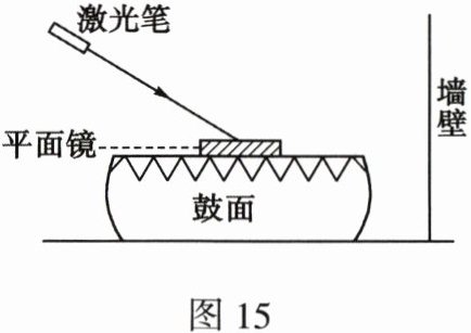 20. 如图 15 所示,在水平鼓面上固定了一块平面镜,用位置固定的激光笔照射平面镜,此时观察到墙壁上出现了一个小光斑。