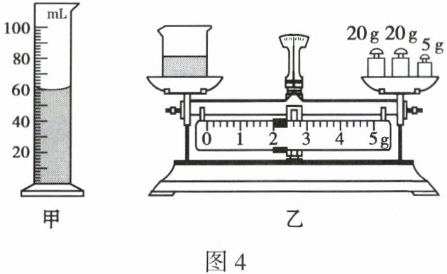 6. 文文想要测量食用油的密度,他用已调好的天平测出烧杯和食用油的总质量,为 92 g;将适量的食用油倒入量筒中,如图 4 甲所示。用天平继续称量烧杯和剩余食用油的总质量如图 4 乙所示,为