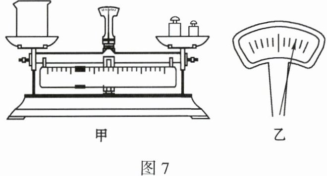 10. 小明想用天平称出 20 g 水,先用正确的方法测出空烧杯的质量,如图 7 甲所示,然后在右盘中增加 20 g 砝码,接着向烧杯中注入一定量的水,指针位置如图 7 乙所示。接下来的操作应该是(