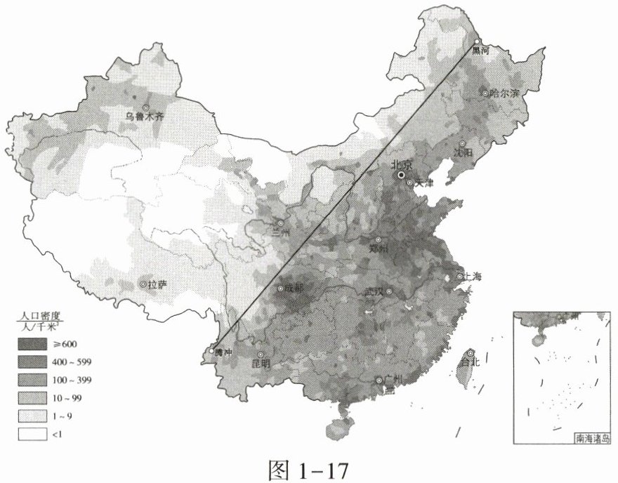 “胡焕庸线”是我国著名地理学家胡焕庸先生在 1935 年提出的,反映了我国人口的空间分布特点。读中国人口分布图(图 1 - 17),完成 18~20 题。