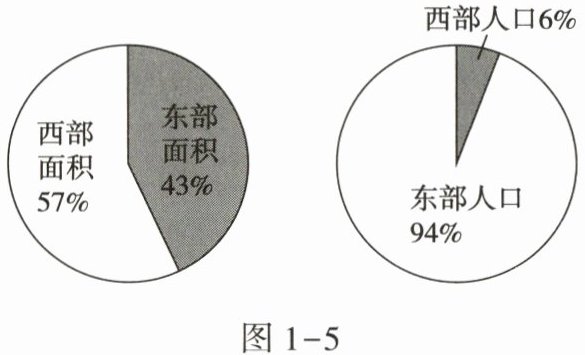 读我国东、西部面积比例与人口比例图(图1-5),完成17~18题。