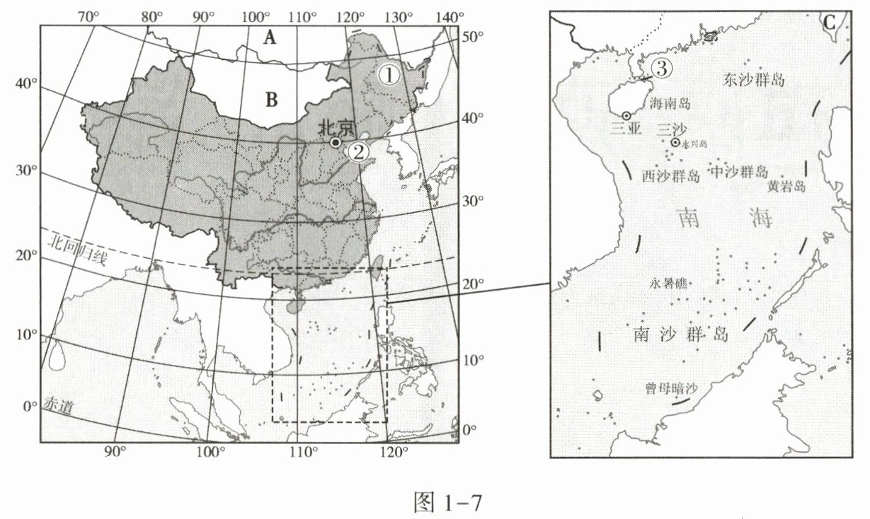 21. 了解国家版图,认知国家版图,树立国家版图意识,是每一位中国公民应尽的义务和责任。某校地理兴趣小组举行了以“一点一线皆山河”为主题的探究活动。读中国疆域示意图(图1-7),完成下列问题。