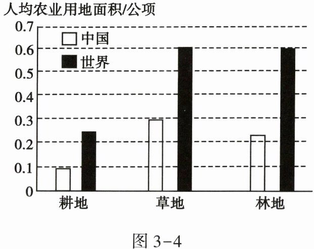 读我国人均农业用地面积与世界人均农业用地面积比较图(图 3 - 4),回答 5~6 题。