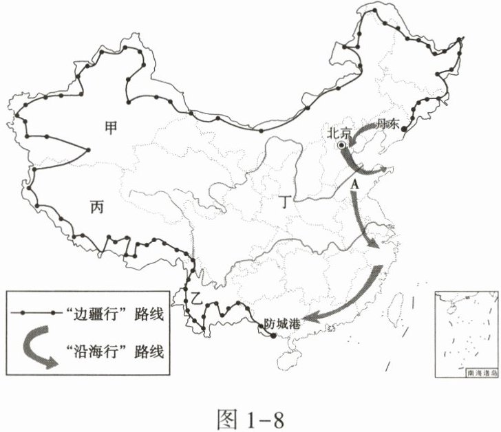 (2)“沿海行”从辽宁的丹东出发,沿我国海岸线,按顺时针方向行进到广西防城港。此路线依次经过的四个海域是渤海、黄海、东海、南海。