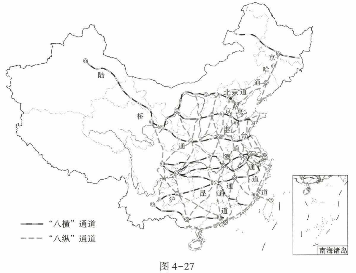 据《中长期铁路网规划》,我国到2030年铁路版图将基本实现“省会高铁连通、地市快速通达、县域基本覆盖”。图4-27为我国“八纵八横”高速铁路主通道分布示意图。读图,完成16~18题。