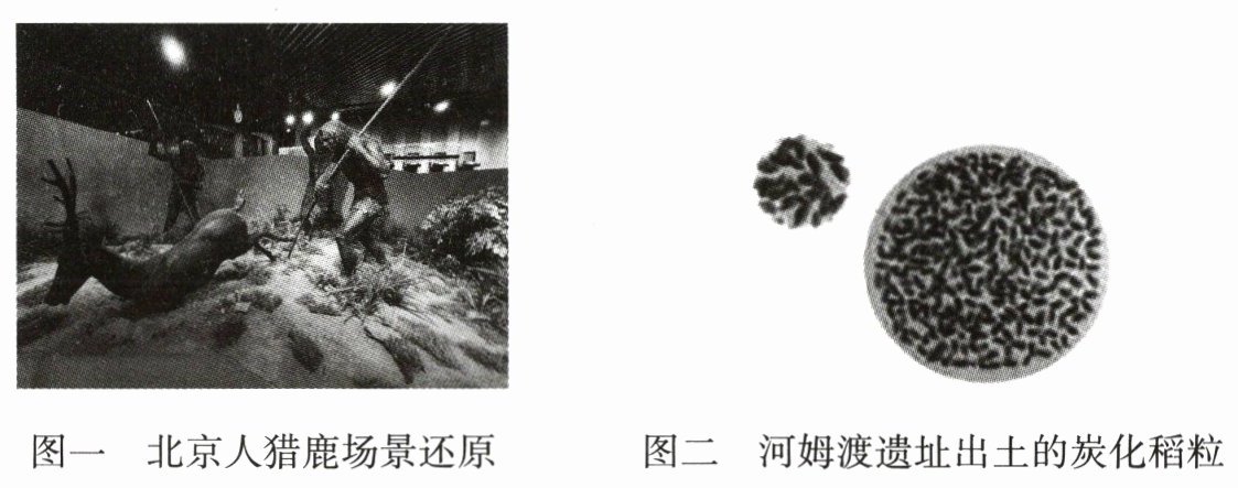 (2)据材料二并结合所学知识,指出北京人和河姆渡人获取食物的方式有何不同。(2分)