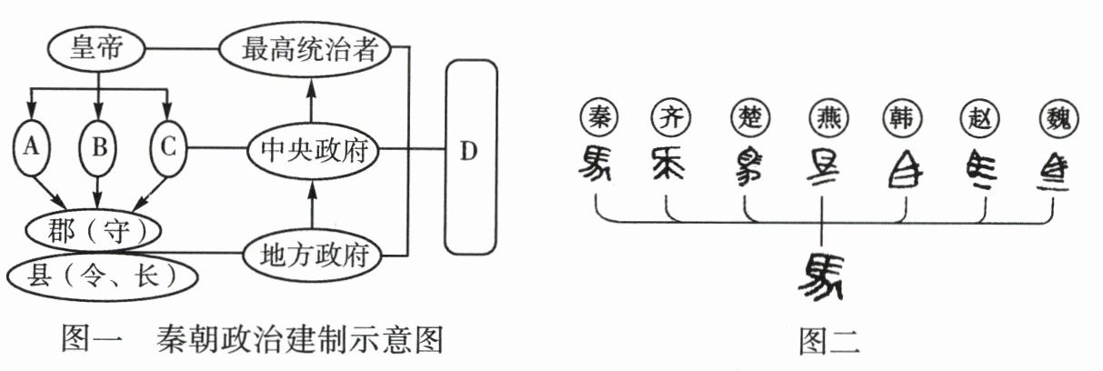 (2) 写出图一 D 处秦朝政治制度的名称。这项制度的理论基础来自战国时期的哪家学说?