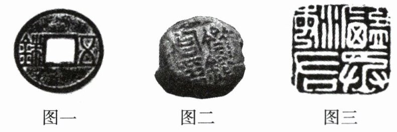 (注:图一为西汉铜币五铢钱,字体清晰,钱重五铢,不易盗铸。图二为西汉郡国齐国的铁官使用的封泥,是检验产品的证明。图三为西汉铜瓦纽“海盐右丞”印)