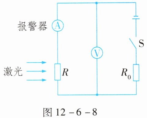 10. 图 12 - 6 - 8 是某地下停车场烟雾报警器的简化原理图,电源两端的电压保持不变,$R_{0}$为定值电阻,$R$为光敏电阻,其阻值随光照强度的减弱而增大,当电路中的电流减小至某一数值时报警器开始报警。闭合开关 S,当有烟雾遮挡射向光敏电阻 R 的激光时,电压表的示数
