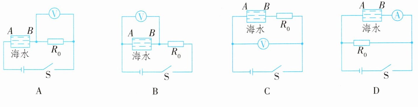 12. 海水的含盐率越高,其导电性能越好,间距固定的金属片 A、B 之间海水的电阻就越小。如图 12 - 6 - 10 所示的电路中,电源两端的电压恒定,$R_{0}$为定值电阻,闭合开关 S,海水的含盐率升高时,电表的示数变小的是(
