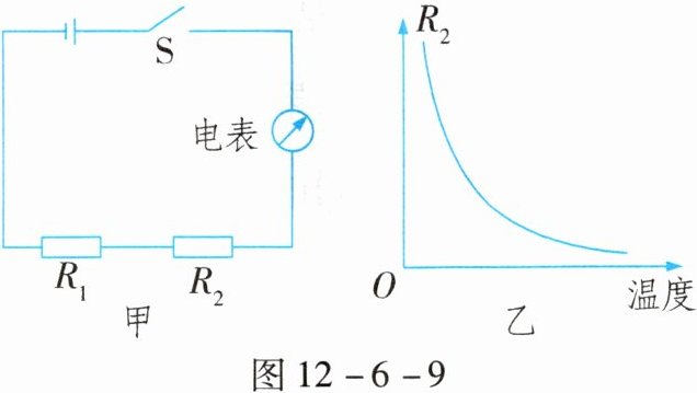 11. 小明有一个可以显示水温的“智能水杯”。为了探究“智能水杯”内部的电路,小明设计了如图 12 - 6 - 9 甲所示的电路来模拟“智能水杯”的功能,电源两端的电压恒定,$R_{1}$是阻值已知的定值电阻;$R_{2}$是热敏电阻,其阻值随温度变化的关系图像如图 12 - 6 - 9 乙所示;电表选用电流表和电压表中的一个,电表的示数可以反映环境温度的高低。闭合开关 S,下列说法正确的是(