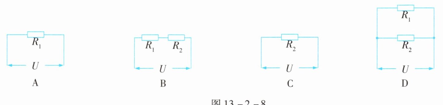 16. 电阻 R₁ 和 R₂(R₁ > R₂)按照如图 13 - 2 - 8 所示的四种方式接在同一电源两端,则电路的总功率最小的是(