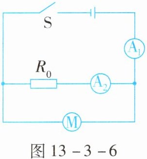 15. 如图$13 - 3 - 6$所示,定值电阻$R_{0}$的阻值为$10\Omega$,电动机线圈的电阻为$2\Omega$。闭合开关$S$,电流表$A_{1}$、$A_{2}$的示数分别为$0.8A$、$0.3A$,则:电源两端的电压为