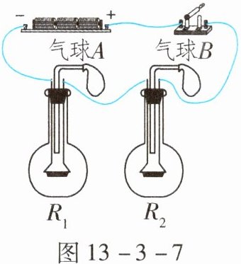 16. 如图$13 - 3 - 7$所示,串联的两根电阻丝($R_{1} < R_{2}$)被封闭在两个完全相同的烧瓶中,并通过玻璃管与相同的气球相连。闭合开关,通过两根电阻丝的电流