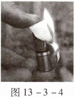 13. 将一张锡纸撕成中间窄、两端宽的条形,把锡纸的两端分别接在一节干电池的正、负极上,锡纸就可以燃烧起来,如图$13 - 3 - 4$所示。锡纸通电后燃烧是因为电流的