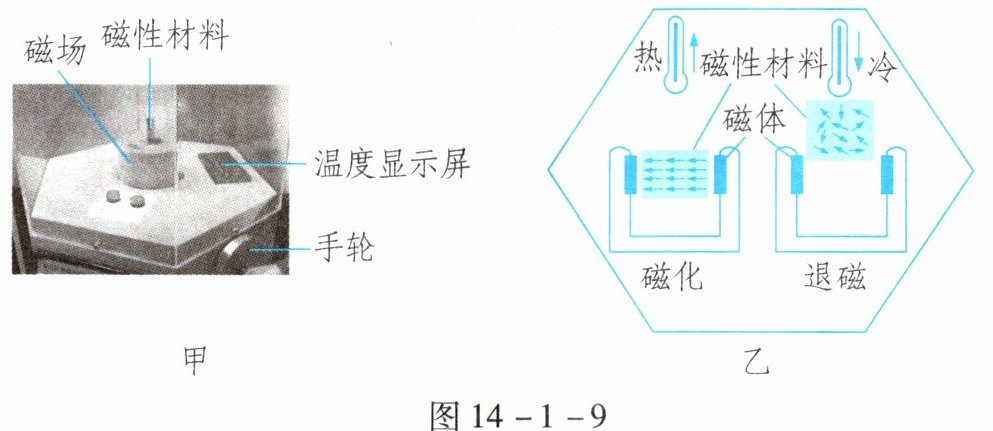 某科技馆展厅有一件展品(如图14-1-9甲所示),为观众展示了磁制冷的原理。转动手轮,当磁性材料(磁制冷材料)进入或离开磁场时,观察到温度显示屏上的示数会发生变化。为什么会出现这种现象呢?科学家们发现磁性物质在磁场作用下温度能够升高,这种现象叫作磁热效应。磁制冷就是利用磁性材料所具有的磁热效应来制冷的。如图14-1-9乙所示,当磁制冷材料被磁化时,能够向外界放出热量,使外界环境温度升高;而退磁时又从外界吸收热量,使外界环境温度降低,从而达到制冷的目的。