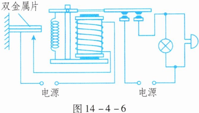 13. 图 14 - 4 - 9 是一种温度自动报警器的原理图,图中的水银温度计在制作时在玻璃管中封入一段金属丝,电源的两极分别与水银和金属丝相连。当温度达到金属丝下端所指的温度时,电流通过电磁铁的线圈,电磁铁产生