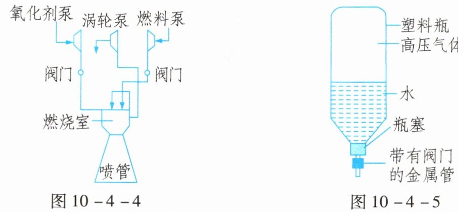 16. 图 10 - 4 - 5 是小礼用塑料瓶制作的水火箭的示意图。小礼先在瓶里装入适量的水,然后将带有阀门的金属管插入瓶塞,旋紧瓶塞后用打气筒往瓶里打足气。打开阀门后,水从尾部的金属管向下喷出,水火箭向上飞起。下列说法正确的是(