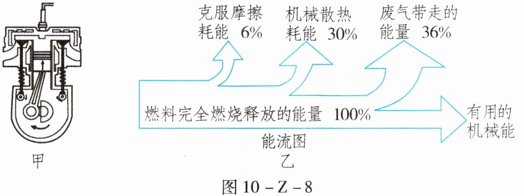 19. 汽车是现代生活中常见的一种交通工具,图10 - Z - 8甲是某四冲程汽油机的某个冲程的示意图,图10 - Z - 8乙是此汽油机工作时的能量流向图。下列说法正确的是(