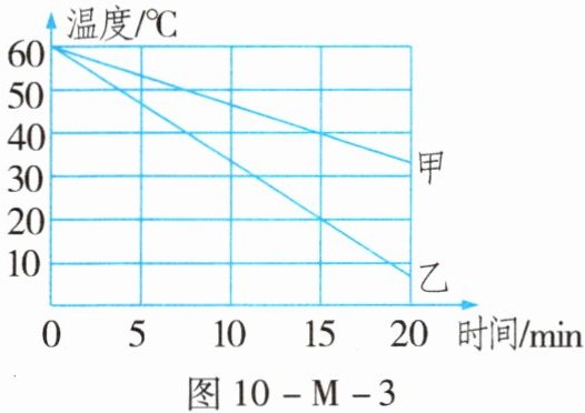 4. 在做“探究物质的放热能力与哪些因素有关”实验时,分别用质量相等的水和某种液体$(c_{水}>c_{液体})$进行了实验。实验中,水和该液体在相同时间内放出的热量相等。两种液体的温度随时间变化的关系图像如图 10 - M - 3 所示。分析图像可以得出,
