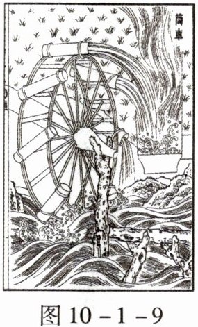 《天工开物》是我国古代的一部科技著作,书中记载着大量的农业机械,其中有这样一段文字描述:“凡河滨有制筒车者,堰陂障流,绕于车下,激轮使转,挽水入筒,一一倾于枧内,流入亩中。昼夜不息,百亩无忧。”该段文字描述了筒车这样一种以水流作动力、把低处的水提升到高处的机械。图 10 - 1 - 9 为一筒车。