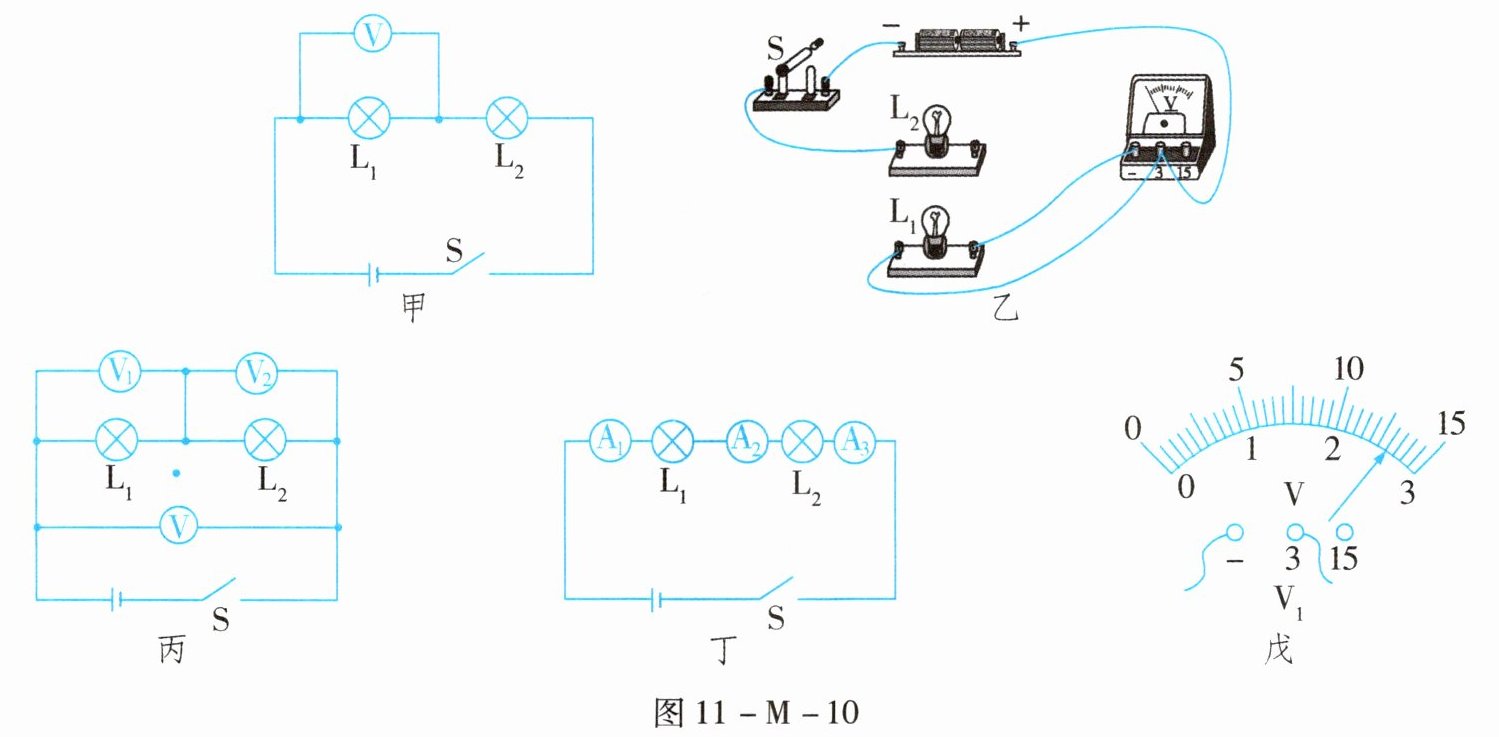 (4)小礼为了验证猜想①和猜想②,添加了多块电流表和电压表。在验证猜想①时,设计了如图 11 - M - 10 丙所示的电路;在验证猜想②时,设计了如图 11 - M - 10 丁所示的电路。两次操作时,确保灯泡 $ L_{1} $ 更靠近电源的正极。小礼连接电路并正确操作后,读出各电压表和电流表的示数并记录在表 11 - M - 1 中。电压表 $ V_{1} $ 的示数如图 11 - M - 10 戊所示,则电压表 $ V_{1} $ 的示数为