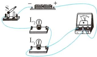 猜想①:灯泡两端的电压与距离电源正极的远近有关,因为灯泡 $ L_{1} $ 更靠近电源的正极,灯泡 $ L_{1} $ 两端的电压比灯泡 $ L_{2} $ 两端的电压要更高,所以灯泡 $ L_{1} $ 更亮。