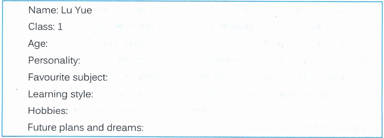 I’m 16 years old this year. I’m outgoing and I get along well with others. English is my favourite subject and I am good at it. I often listen to English songs and practise speaking with my classmates to improve my spoken English. Also, I often take notes in class, which is really helpful. I enjoy playing volleyball in my spare time because I find it a good way to keep fit and make friends. My dream is to become an English teacher in the future.