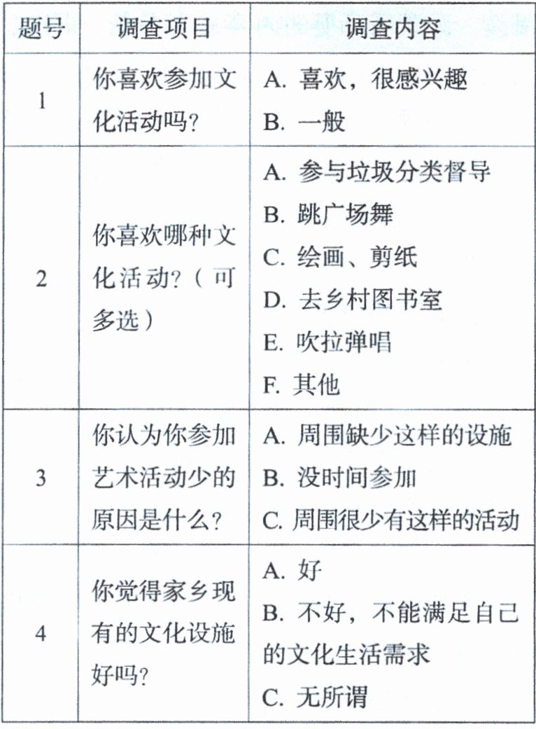 3. 下面是某校社团关于“家乡群众性业余文化活动”的专题调查表的部分内容。你觉得调查表在内容的设计上有什么问题?请找出并加以说明。