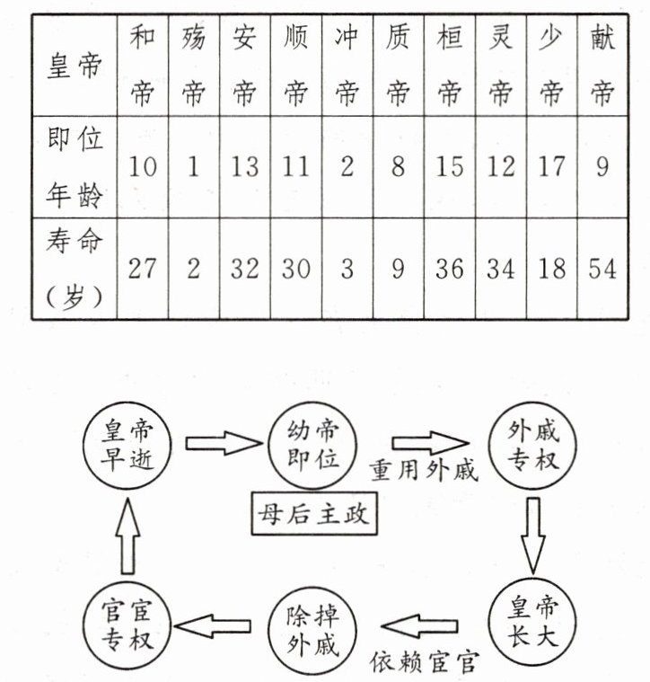 (1)问题:东汉和帝以后即位的皇帝年龄都偏小。现象:外戚和宦官交替专权。危害:使社会长期动荡混乱,加深了人民的苦难。
