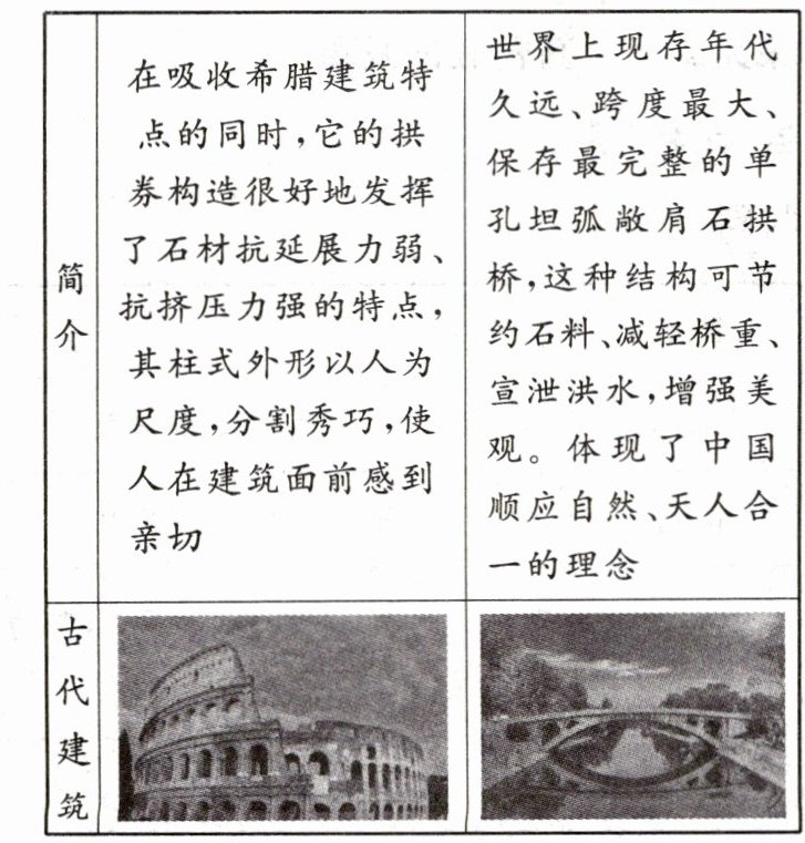 | 简介 | 在吸收希腊建筑特点的同时,它的拱券构造很好地发挥了石材抗延展力弱、抗挤压力强的特点,其柱式外形以人为尺度,分割秀巧,使人在建筑面前感到亲切 | 世界上现存年代久远、跨度最大、保存最完整的单孔坦弧敞肩石拱桥,这种结构可节约石料、减轻桥重、宣泄洪水,增强美观。体现了中国顺应自然、天人合一的理念 |